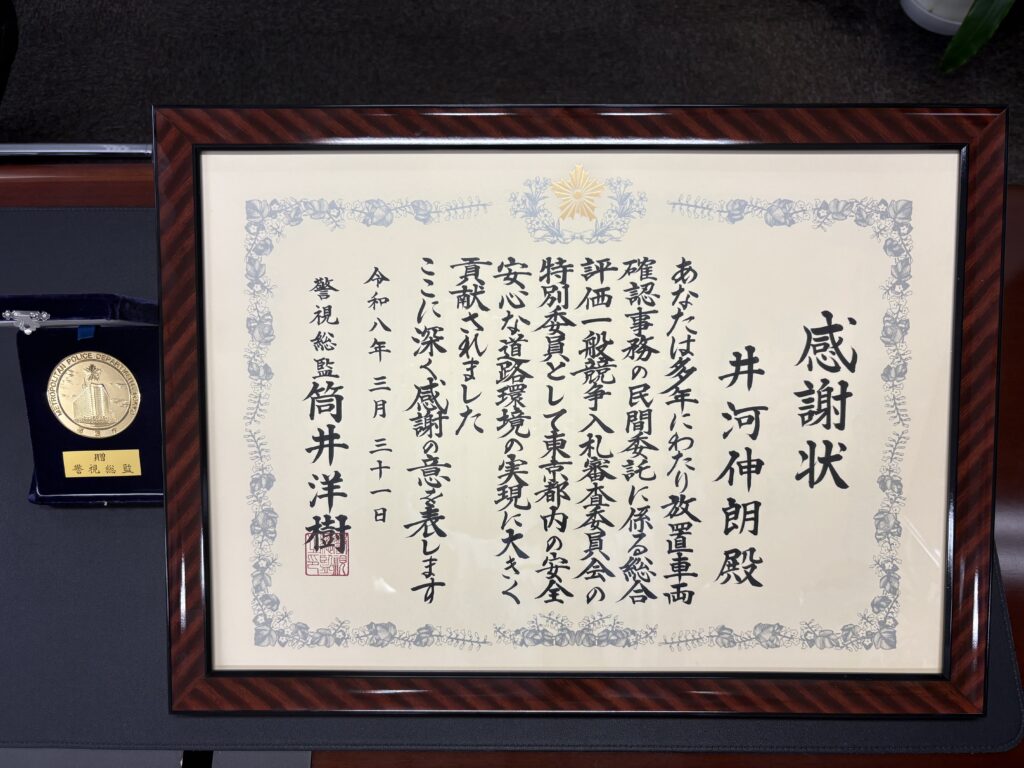 昨年(2025年)まで放置車両確認事務の民間委託に係る総合評価入札審査委員会の特別委員を務めておりましたが、約20年の長期にわたって特別委員を務めたことが評価された、と伺っています。